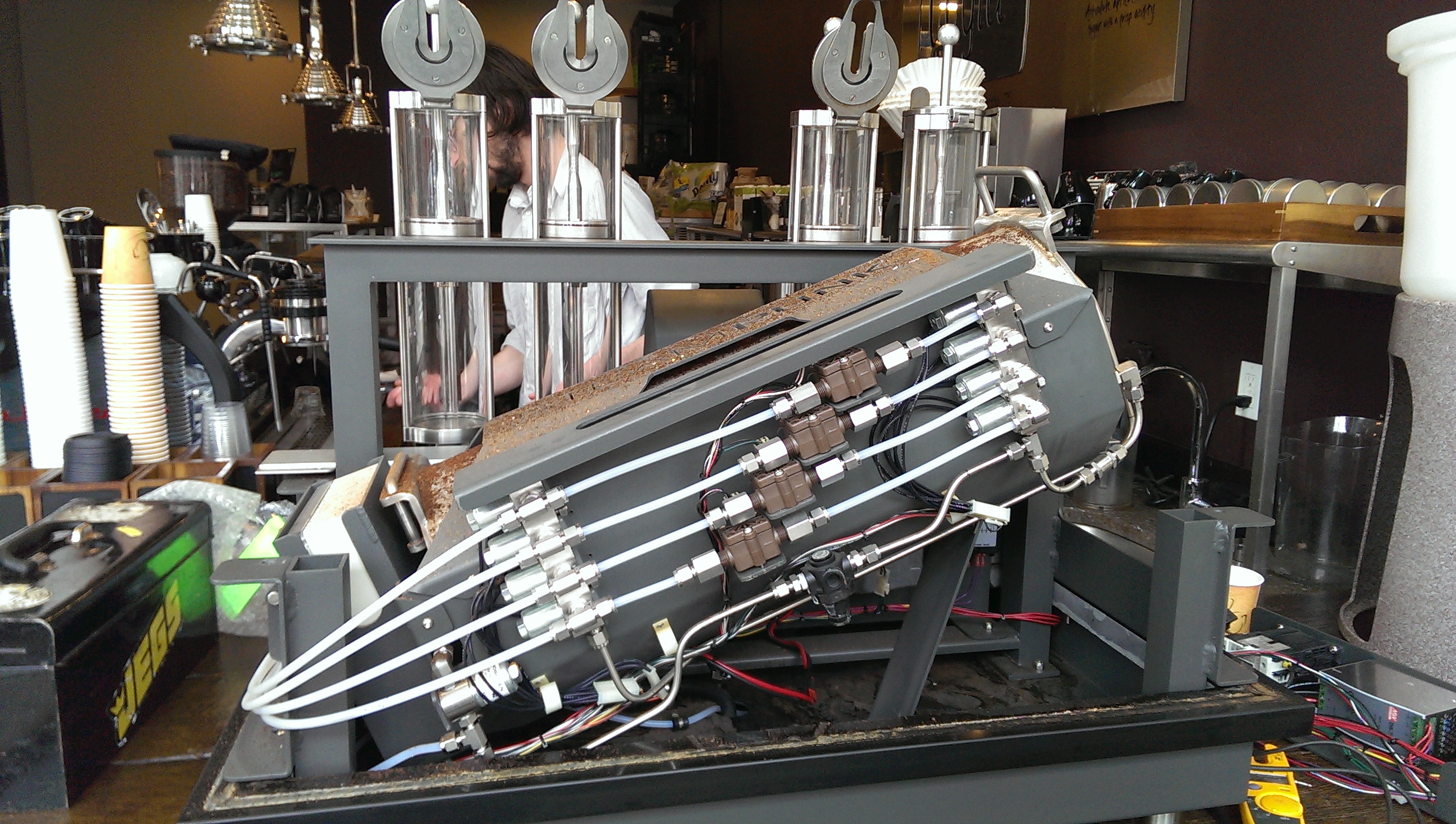 Servicing the steampunk coffee brewer. This machine is faultier than any other machine I have used in my life. It makes decent coffee.